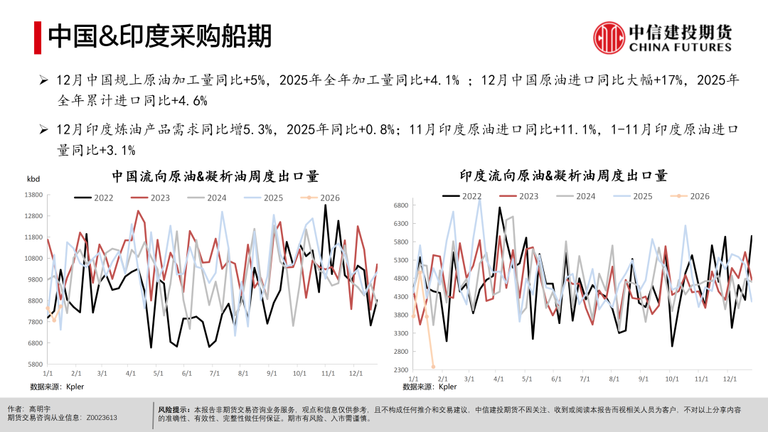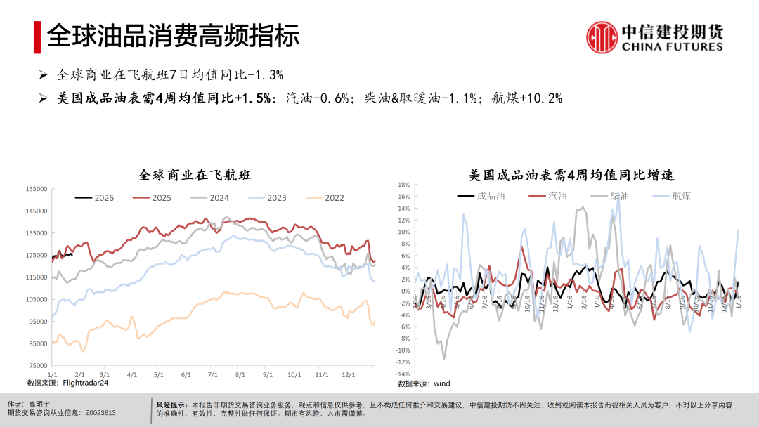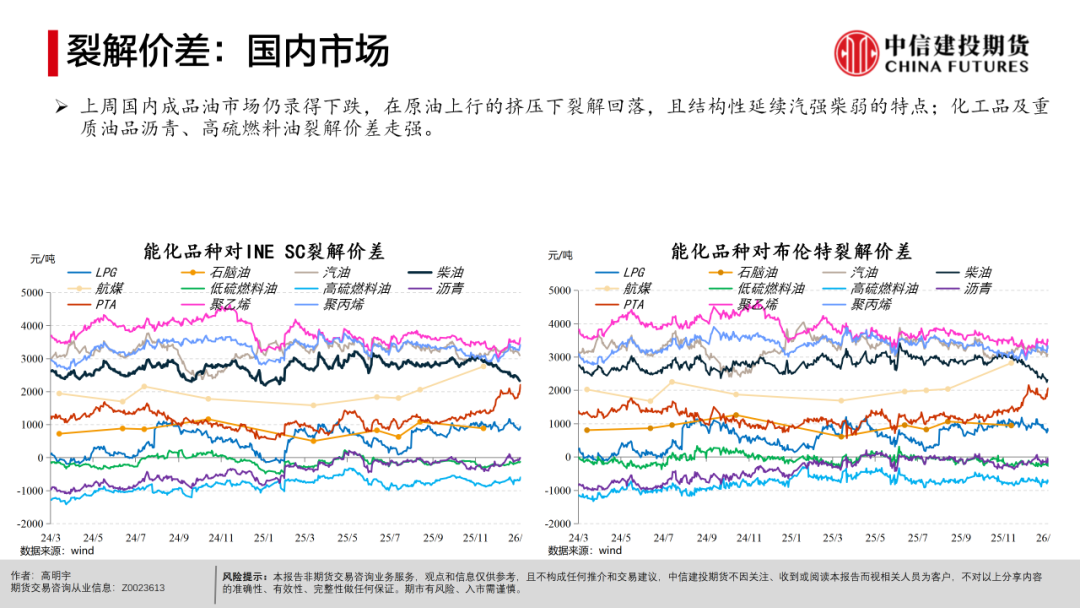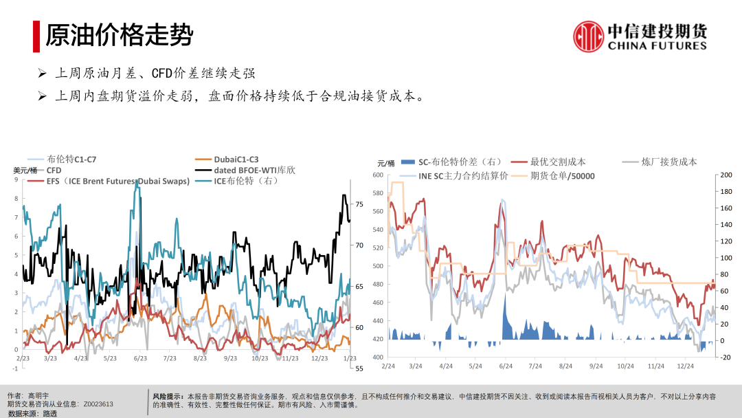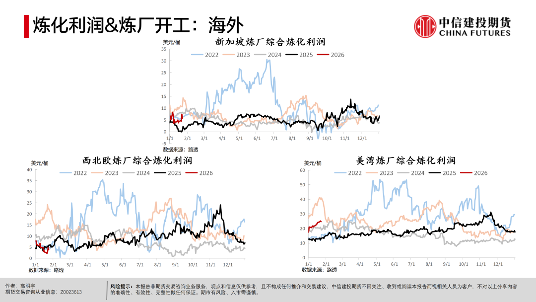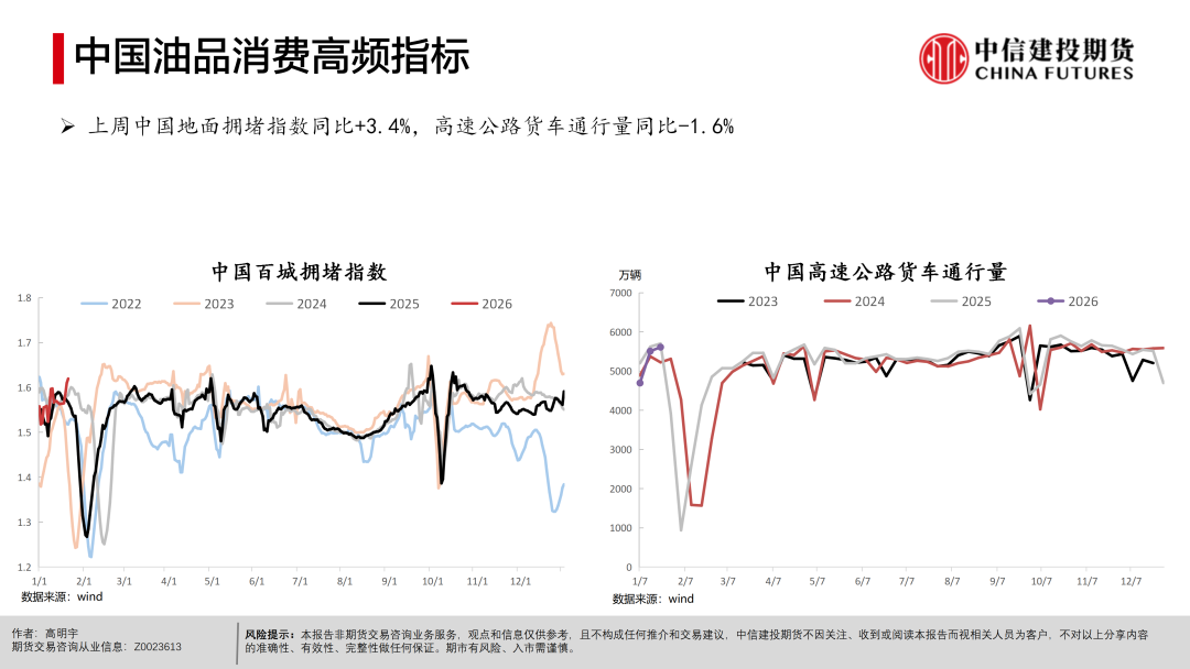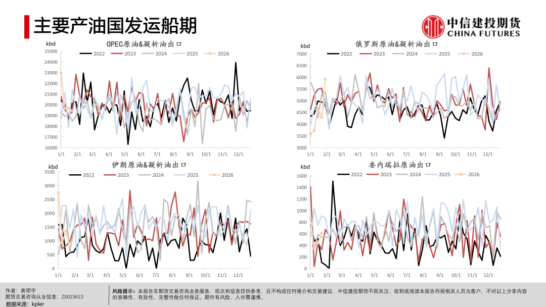 供应:截至1月16日当周美国原油产量1373.2万桶/天,近四周产量同比增1.9%,上周美国非墨西哥湾原油钻机数增加2台至403台,低位油价区间美国减产压力初步体现。近期供应端预期及现实层面均对油价构成短期支撑,一方面伊朗地缘风险经历了阶段性降温后近日再度回暖,美军包括“亚伯”号核动力航母及3艘导弹驱逐舰在内的战斗群组正在驶向中东,周五美国财政部发布新一轮针对伊朗镇压国内抗议者的油轮制裁,Polymarket定价上半年美国打击伊朗的概率回升至69%。另一方面受1月18日电力系统起火影响,哈萨克斯坦Tengiz油田预计停产7-10天,而11月以来CPC出口终端单点系泊装置的检修及遇袭已导致该港口原油出口量自10月的145.7万桶/天回落至1月的71.4万桶/天,轻质高硫油种实货市场受到支撑。