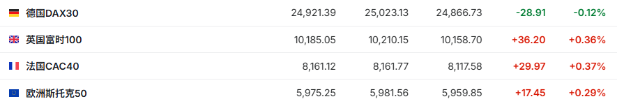 2. 截至发稿,德国DAX指数跌0.12%,英国富时100指数涨0.36%,法国CAC40指数涨0.37%,欧洲斯托克50指数涨0.29%。