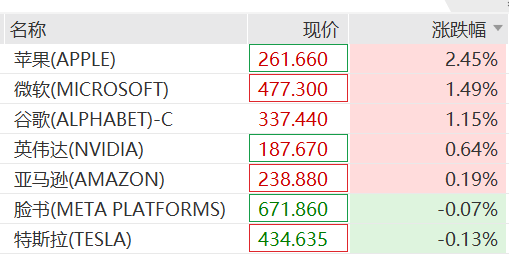 美股科技七巨头中涨多跌少,苹果涨超2%,谷歌C涨超1%。消息面上,据财联社报道,谷歌正式发布将于2026年5月1日对CDN Interconnect、Direct Peering、Carrier Peering等方式进行数据传输的价格进行调整,其中北美地区翻倍。