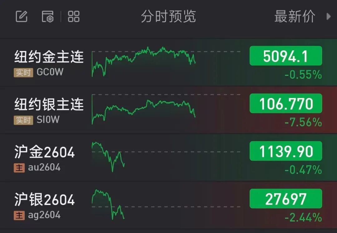 截至发稿,纽约期金报5094.1美元/盎司。纽约期银报106.77美元/盎司,跌幅扩大至7.56%。国内沪银期货主力合约一度下探至27500元关口附近,从涨超3%直线回调至跌超3%,截至发稿,最新报27697元/千克,跌幅为2.44%。