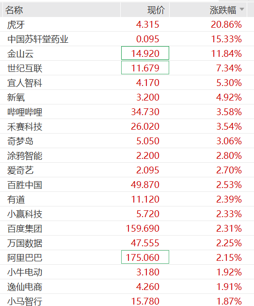中概股拉升,热门个股方面,虎牙涨超20%,苏轩堂药业涨超15%,金山云涨超11%,哔哩哔哩涨超3%,百度集团、阿里巴巴涨超2%。