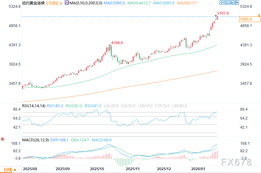 四月黄金期货:多头的下一个上行目标是令收盘价站稳5250.00美元这一强劲阻力位上方。空头的近期下行目标则是将期货价格打压至4750.00美元这一关键技术支撑位下方。首要阻力位为历史高点5145.20美元,下一阻力位为5200.00美元;首要支撑位为隔夜低点5043.90美元,下一支撑位为5000.00美元。