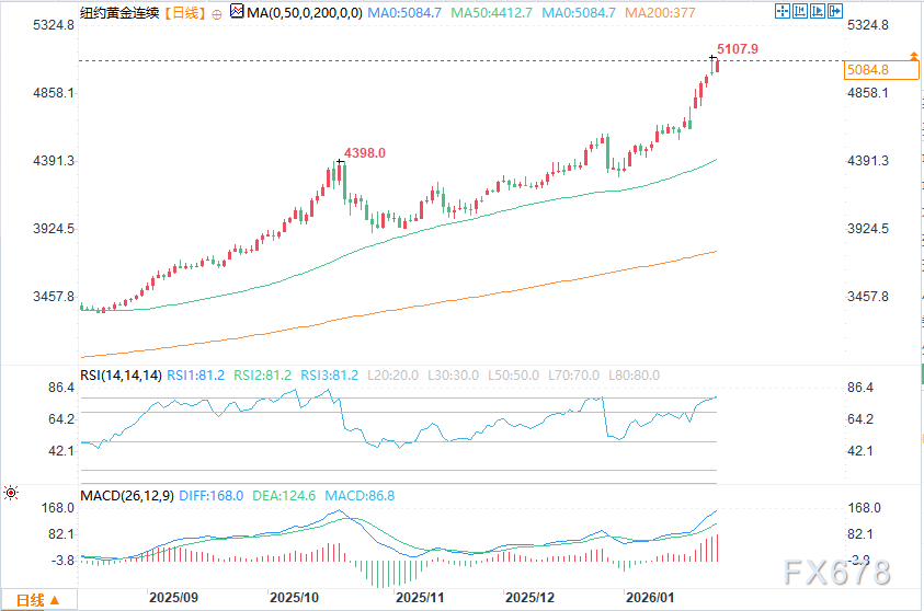 自1月19日金价跳空高开于4642.97美元后,交易者便持续采取追涨、顺势做多的策略。周一的价格走势,是六个交易日以来动能首次显现疲态的信号。若今日无法突破5111.51美元,将是动能转向的又一信号;而一旦跌破4990.21美元,则确认动能正式转向。