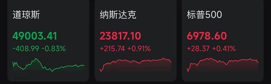 美股市场方面,三大指数涨跌不一,其中标普500指数盘中创新高。截至收盘,道指跌0.83%,报49003.41点;纳指涨0.91%,报23817.10点;标普500指数涨0.41%,报6978.60点。