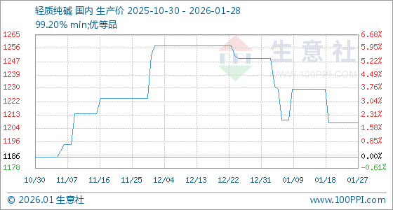 1月28日,生意社轻质纯碱基准价为1208.00元/吨,与本月初(1250.00元/吨)相比,下降了3.36%。