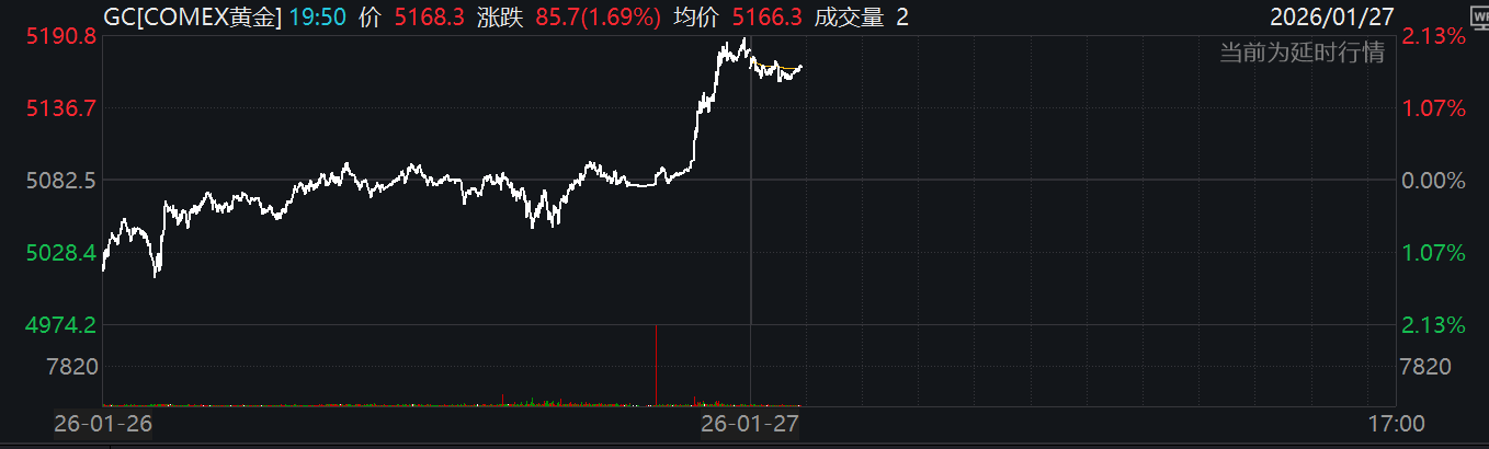 1月27日,受特朗普表态对美元贬值持宽容态度及美国政府重现停摆危机影响,现货期货金价早盘小幅回调后再度强势走高,盘中触及5190美元后尾盘小幅回落,截至收盘,COMEX黄金期货上涨1.91%报5179.60美元/盎司,黄金ETF华夏(518850)涨0.08%,黄金股ETF(159562)跌0.26%,有色金属ETF基金(516650)跌1.35%。
