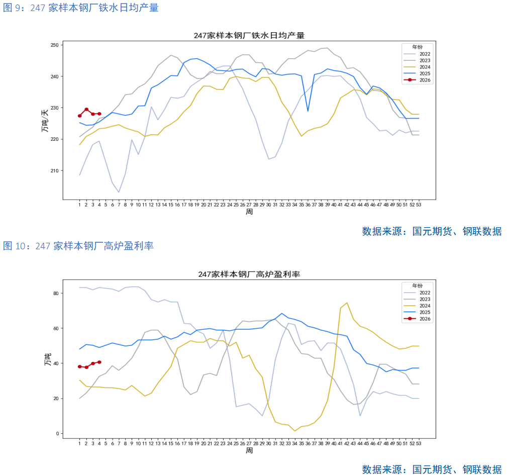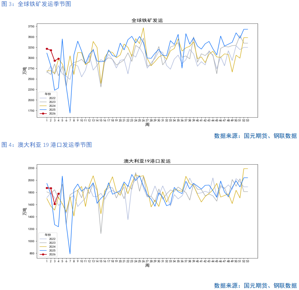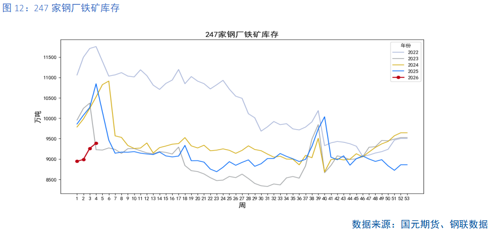 供应方面:1月全球周均发运量为3075.7万吨,月环比下降12.76%,年同比增加17.33%。年末冲量后,铁矿发运在一月季节性走低,但是仍高于去年同期。1月17日,第一船近20万吨西芒杜铁矿石,顺利运抵中国港口。目前西芒杜铁矿产量处于爬坡阶段,预计发运量前低后高。供应宽松预期压制矿价上行空间,天气对澳大利亚和巴西铁矿发运的影响需要重点关注。