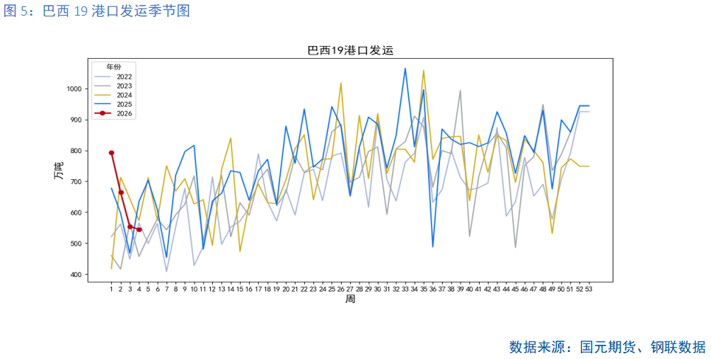 1月全球周均发运量为3075.7万吨,月环比下降12.76%,年同比增加17.33%。其中,巴西19港口发运638.83万吨,月环比下降24.34%,年同比下降0.90%;澳大利亚19港口发运1783.38万吨,月环比下降8.56%,年同比增加21.86%。从矿山发运来看,FMG周均发运量为398.0万吨,月环比增加1.44%;BHP周均发运量为547.28万吨,月环比下降4.87%;力拓周均发运量为595.35万吨,月环比下降20.28%;淡水河谷周均发运量为479.22万吨,月环比下降20.47%。