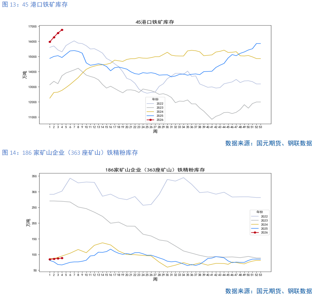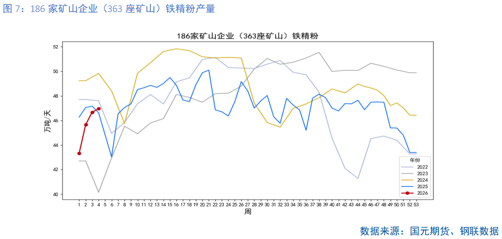国产矿生产方面,1月186家矿山企业(363座矿山)铁精粉日均产量为45.65万吨/天,月环比增加2.03%;年同比下降0.74%。