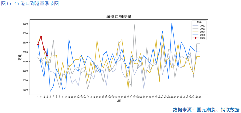 1月,45港口周均到港量2716.62万吨,月环比增加3.97%,年同比增加35.59%。