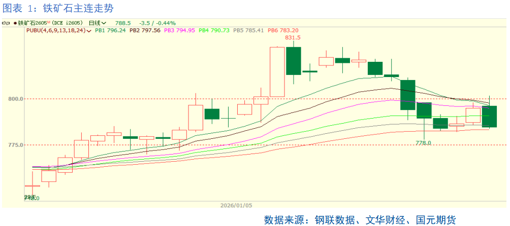 1月铁矿主力价格先扬后抑。上旬,在宏观预期改善带动下,市场情绪明显修复。央行在年度工作会议中重申“适度宽松”的货币政策取向,提振黑色板块。1月上旬钢材有所复产,及炉料补库预期矿价走强。下旬,矿价走弱。宏观情绪释放,黑色板价格回归基本面。铁矿石库存不断累至新高,矿价前期表现坚挺,钢厂补库进程较为缓慢。
