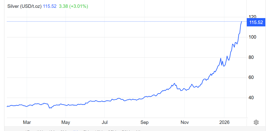 据统计,黄金在2025年飙升了70%,创下自1979年以来的最大年度涨幅,白银2025年涨幅则高达150%,同样创下1979年以来最佳的年度表现。进入2026年,黄金与白银涨势并未停歇,反而因全球局势的动荡而加速,尤其是银价已经来到“三位数”时代。