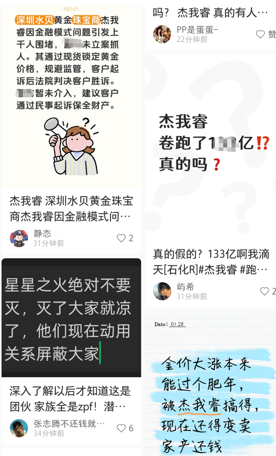 据第一财经,近日,杰我睿名下的“杰我睿珠宝”及多个关联的线上平台 “龙冶金”“金城金世界”均出现了兑付困难,波及众多投资者。