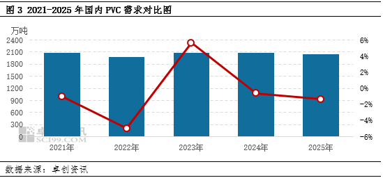 2025年中国PVC粉需求进一步转弱,2025年中国PVC粉消费量在2047.03万吨,较2024年消费量下降1.35%。需求转弱的主要原因,一方面是房地产行业仍然相对低迷,新开工数据不佳,管型材企业订单不佳,整体开工保持在相对偏低的水平,对PVC粉需求减弱;另一方面,医疗及日用包装类需求虽然在促消费的支撑下有所增长,但增长幅度有限。