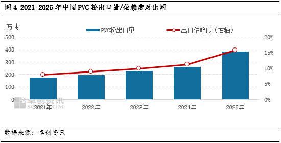 2021-2025年中国PVC粉出口保持高增长态势,近五年出口量复合增长率达43.47%。2025年出口量继续快速增加,据海关数据统计,2025年PVC粉出口量在382.32万吨,同比增加46.09%。出口的快速增加,主要是国内PVC价格快速下跌,2025年国内PVC粉年均价下跌13.37%,出口价格也跟随相应回落,PVC粉出口的价格优势明显增加。另一方面海外需求仍处于增长状态。