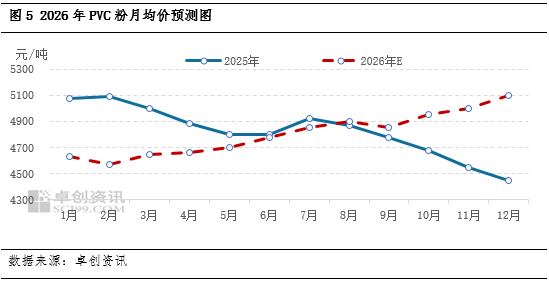 总体来看,2026年国内PVC粉价格重心或将略降,年均价或将在4803元/吨,年内月均价趋势呈现前低后高、震荡上行的趋势。其中高点预计出现在12月,低点预计出现在2月。影响市场走势的主要驱动来看,基本面弱势仍将延续,将对市场形成拖累,但化工品将迎来景气周期、“反内卷”对供应造成扰动的强预期存在,上半年或将在弱现实与强预期之间博弈,价格底部震荡。下半年预期反内卷政策落地概率较大,供应端产量或将受到扰动,所以下半年价格预计高于上半年。
