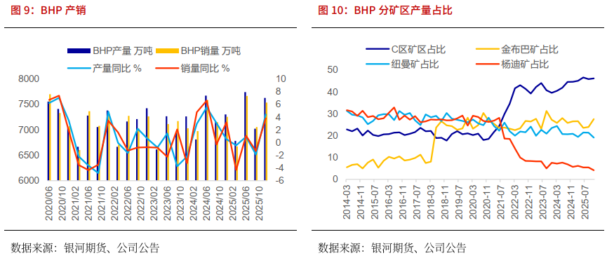 BHP:四季度BHP产销维持高位,2026财年铁矿石目标指导量维持2.84-2.96亿吨(100%基准),区间目标相较于2025财年上调200万吨,预计整体发运处于区间目标中值,2026年发运小幅增加200万吨。