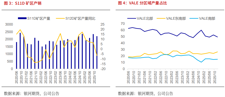 北部系统:产量同比下降650万吨, 四季度总产量为4480万吨,主要原因:(1)Serra Norte的原矿供应,部分被矿山计划中产品组合调整的积极影响所抵消;(2)在持续运营绩效改进的推动下,S11D在2025年实现了创纪录的8600万吨产量。
