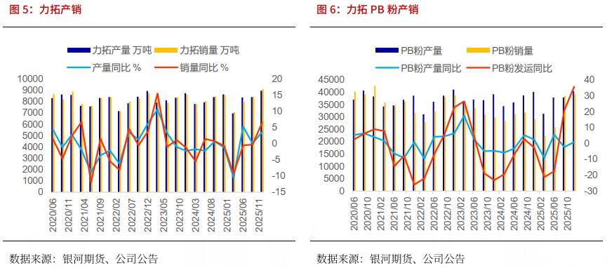 Samarco 四季度产量190万吨,产量同比较快增加,主要在于第二座选矿厂在产能提升后表现更佳,且矿品位和回收率均有所提高。10月,萨马尔科公司董事会批准了第三阶段选矿厂项目。萨马尔科公司将投资24亿美元(100%股权)用于在2028年和2029年期间,通过分阶段重新启用选矿厂和造球厂基础设施中剩余的潜在产能,将产能提升至约2600万吨/年(100%股权)。2026财年的生产指导目标仍维持在700万吨至750万吨之间不变,目前预计产量将处于该区间的上半段,而计划中的维护工作将在下半年进行。