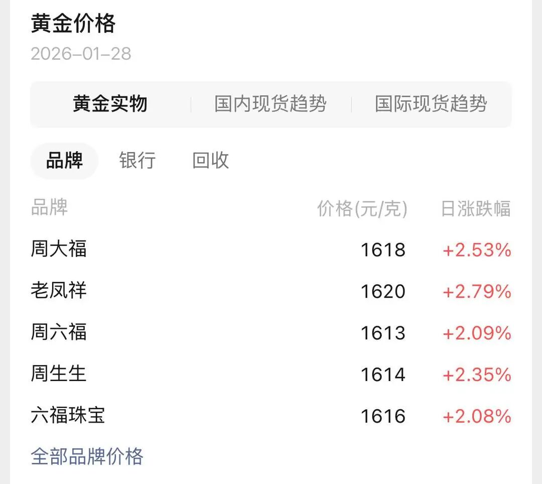 国际金价的暴涨迅速传导至国内零售市场。1月28日,国内主流金饰品牌报价应声刷新高位,首次突破1600元/克大关。