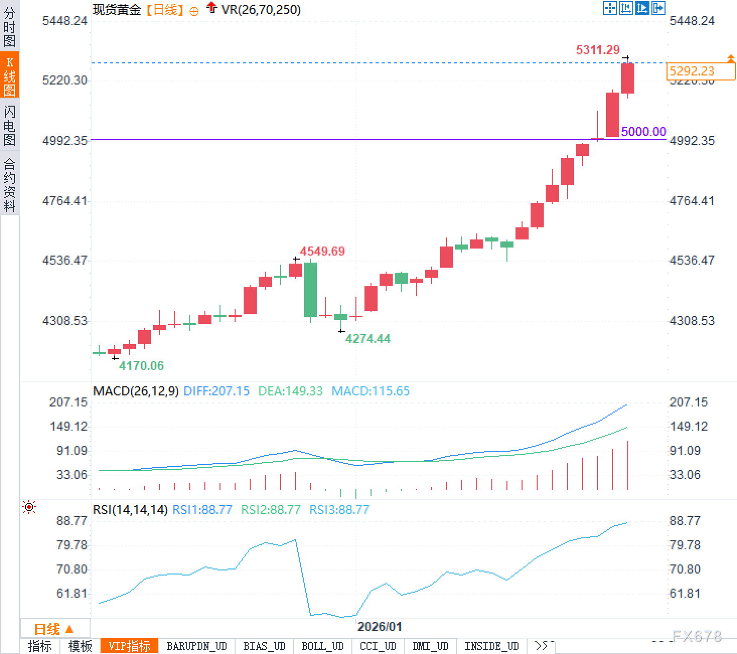 汇通财经APP讯——现货黄金近期持续走强,1月28日周三,价格一度冲至5311.29美元附近,刷新阶段性高点。这波上涨并非突然爆发,而是经历了关键整数关口的有效突破:5000.00美元一线由原先的压力位转变为当前的强力支撑。一旦价格回踩该位置不破,趋势资金往往顺势加码,推动行情进一步上行。目前来看,市场的上涨节奏呈现出典型的“浅回撤、快拉升”特征,说明短线资金的追涨意愿强烈,多头明显强化。