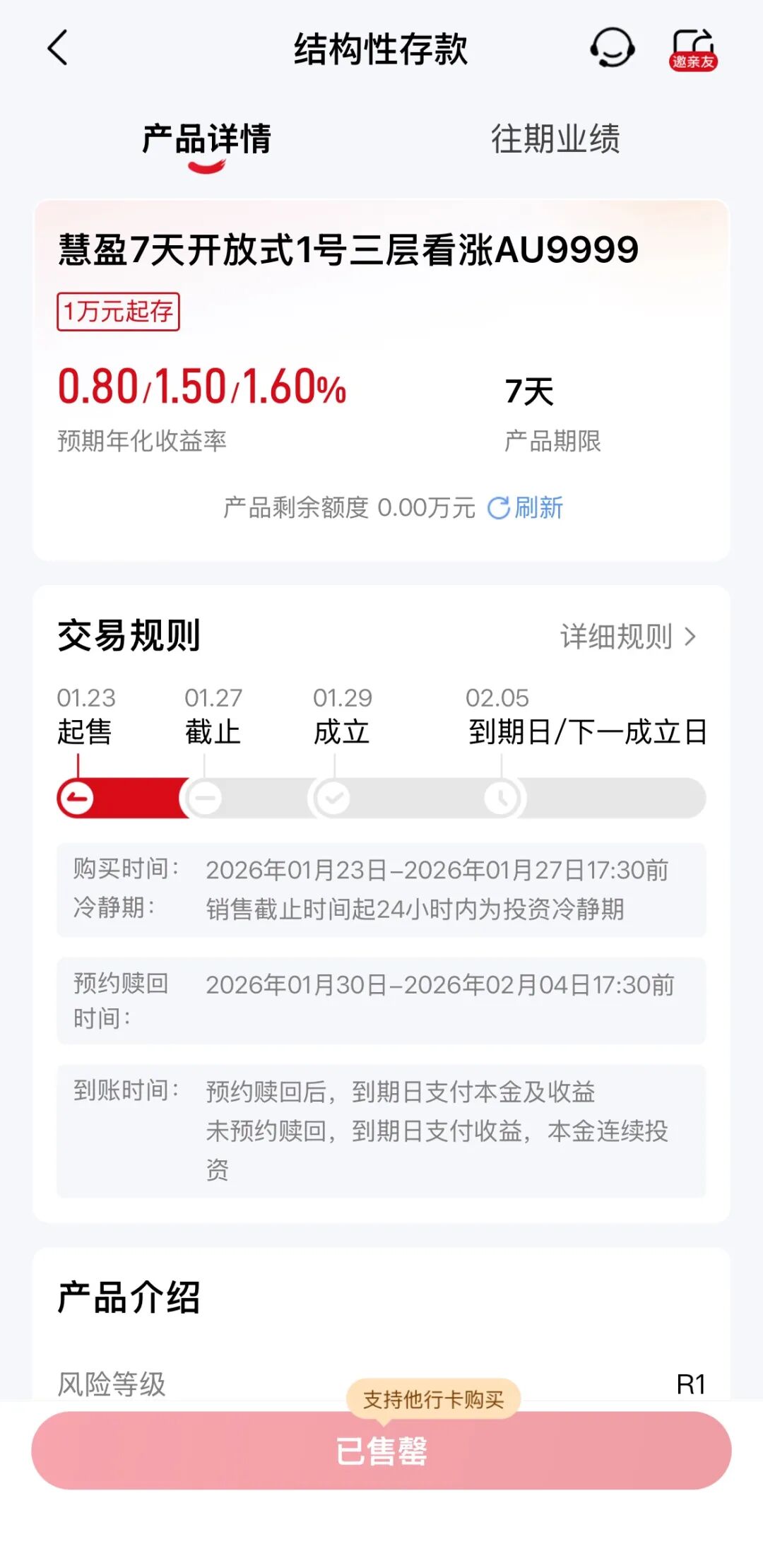 华夏银行App目前显示的“慧盈7天开放式1号三层看涨AU9999”,产品期限7天,预期年化收益率0.8/1.5/1.6%,1万元起存,目前已售罄。另据公开信息,华夏银行的“慧盈2441号三层看涨AU9999”产品,25日上午还可认购,下午便已售罄。