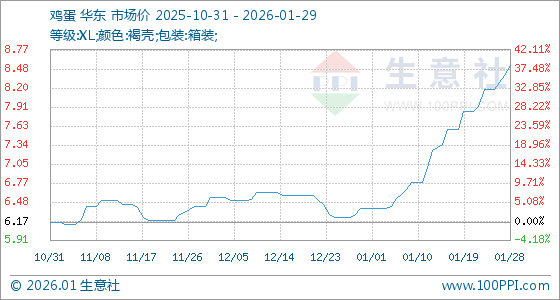 1月29日,生意社鸡蛋基准价为8.53元/公斤,与本月初(6.38元/公斤)相比,上涨了33.70%。