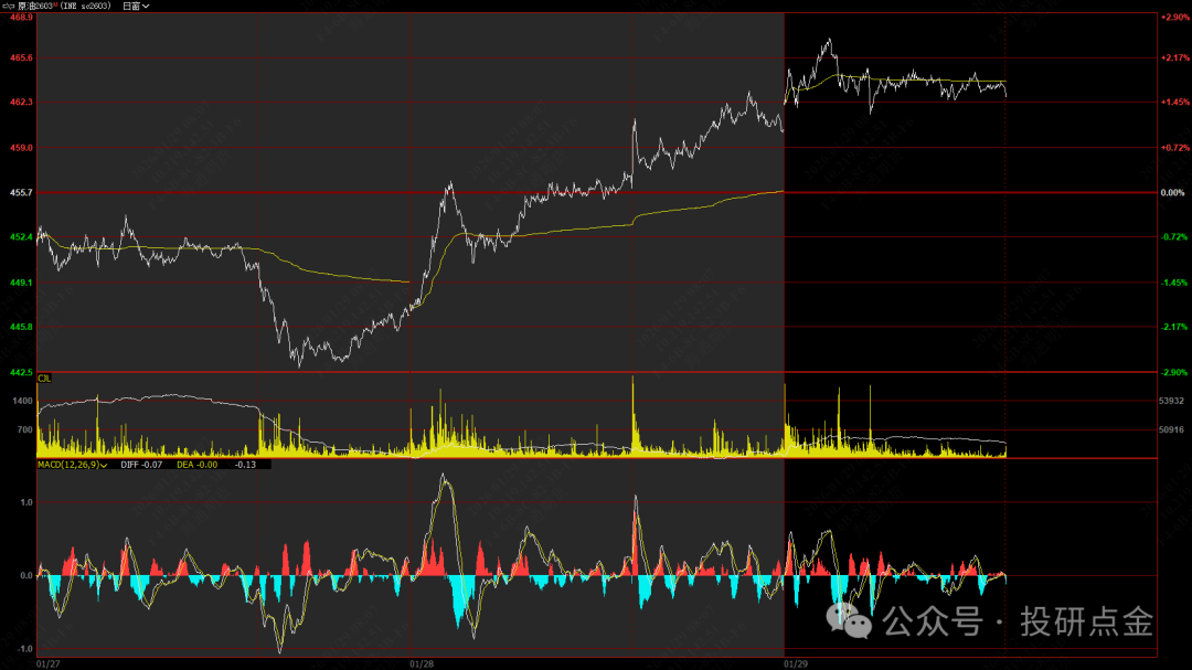原油从周二夜盘就开始上涨,尤其欧美市场油价大涨3%,收盘价刷新了3个月来的新高,油价走强同时,月差同步大幅反弹。相比之下我国SC原油新年来表现明显弱于海外市场,但同样有大幅走高表现,最终主力合约SC2603收盘460.3元/桶,较上一交易日涨幅2.49%,持仓增加74手。