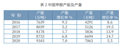 甲醇是我国重要的化工原料和燃料,进入 21 世纪以来,我国甲 醇产业步入快速发展的轨道,尤其是 2002 年初以来,我国甲醇市场 受下游需求强力拉动,甲醇生产企业纷纷扩产和新建装置,使得我国 甲醇产能急剧增加,产量连年大幅增长。经历了十几年的快速发展之 后,2015 年开始,我国甲醇行业迎来调整、转型、升级的时代,甲 醇产能增速明显放缓,企业间兼并重组、行业往大型化发展。截止到 2020 年底,我国甲醇产能达到 9343 万吨;2020 年我国甲醇实际产量 7063 万吨,是全球最大的甲醇生产国。