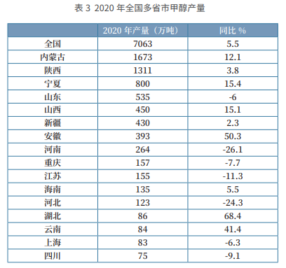 根据资讯机构数据显示,2020 年,我国甲醇产量累计值排名前 五名的省份分别是内蒙古 1673 万吨,陕西 1311 万吨,宁夏 800 万 吨,山东 535 万吨,山西 450 万吨,五省合计占全国甲醇总产量的 67.5%。