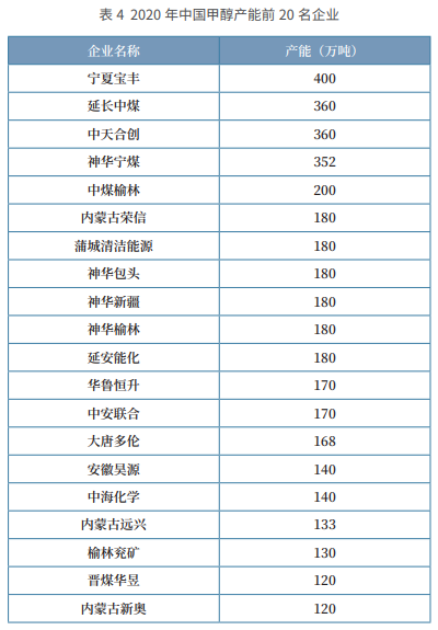 我国甲醇生产企业近年来向着大型化方向发展,行业集中度进一 步提高。截至 2020 年底,我国甲醇产能超百万吨级的企业数量达到 24 家,占总产能的 48%,较 2014 年增加 16 个百分点。而产能在 50 万吨以上的企业占到总产能的 7 成左右。2020 年我国甲醇产能前 24 名的企业,甲醇产能均在百万吨以上。