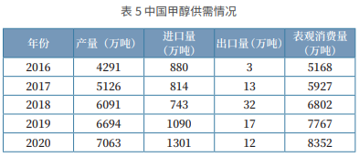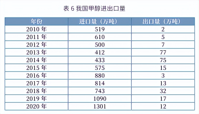我国是全球甲醇第一大消费国。近年来随着烯烃需求的不断扩大,甲醇消费量呈现明显的增长,成本较低的进口甲醇成为了有效补充。特别是华东和华南地区,进口甲醇的占比很大。2020 年,我国甲醇进口量1301万吨,同比增速19.4%。与进口相比,我国甲醇出口量一直很低。
