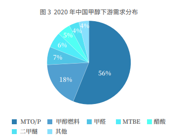 从甲醇下游的分布来看,近年来随着甲醇制烯烃行业的不断发展, CTO/MTO 行业的需求占比逐年提高,截止到 2020 年底,甲醇制烯烃 在甲醇下游需求中的占比达到 56%,是甲醇第一大下游,而传统的甲 醛、醋酸、二甲醚和 MTBE 等占比分别是 7%、5%、5%、6%。