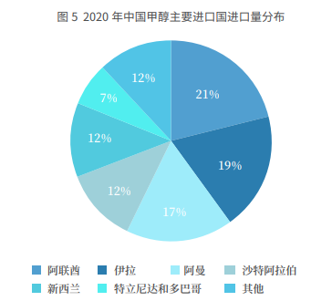 按国家来看,2020 年中国甲醇进口量位居前五名的国家分别是; 阿联酋 277 万吨,伊朗 247 万吨,阿曼 214 万吨,沙特阿拉伯 155 万 吨,新西兰 154 万吨。