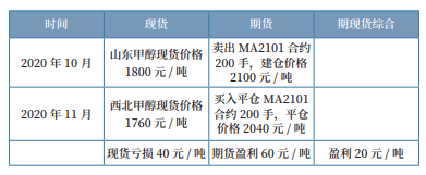 当时山东甲醇现货价格为 1800 元 / 吨。为规避期间的价格下跌 风险,锐特以 2100 元 / 吨卖出 200 手 MA2101 合约。两周后,生产 装置重启,2000 吨甲醇顺利交付。锐特则在期货市场择机买入平仓。