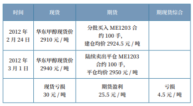 2012 年 2 月中上旬,中嘉华宸判断近期甲醇价格出现上涨的概 率较大,为了规避甲醇价格上涨带来的成本抬升的风险,公司考虑 在期货上进行部分买入套保并交割。公司期货部在 2012 年 2 月 24 日分批建仓 ME1203 合约 100 手,建仓均价 2924.5 元 / 吨。随着交 割日期临近,ME1203 的流动性越来越差,考虑到实际交割费用较多, 交割运距远,且存在增值税等风险,于是公司决定在 3 月 1 日前将 100 手 ME1203 合约逐步平仓,并在现货上按照计划采购 5000 吨甲醇。