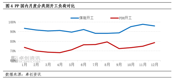 虽不同路径制PP成本均有不同程度的下滑,但煤制PP成本仍处于成本路线最低端。从利润水平方面来看,煤制PP毛利表现依旧相对较好。2025年煤制PP平均毛利为336.89元/吨,除此之外,其余各路径制PP毛利水平均为负值。油制PP毛利为-354.93元/吨,PDH制PP毛利在-899.15元/吨。同时结合PP开工负荷来看,2025年煤制PP生产企业凭借成本改善尚能保持高开工运行,开工水平基本维持在90%左右,而PDH制PP企业则因亏损严重陷入频繁停车的不良循环,开工水平多在70%-80%左右。