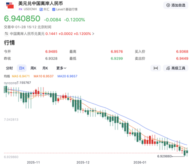 2026年开年,人民币汇率市场延续强势行情,人民币中间价、在岸及离岸人民币对美元即期汇率均强势“破7”。其中,1月27日,离岸人民币对美元盘中更是升破6.93。