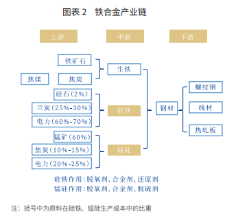 在需求上,锰硅和硅铁都用于下游钢铁生产,但所制造的钢材种 类既有重合又有区别。例如生产每吨螺纹钢一般添加 20kg 锰硅和 4kg 硅铁,但热轧卷板由于对锰元素需求较少,因此只添加硅铁而基本不 添加锰硅合金。