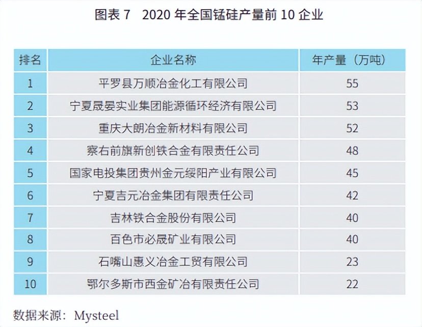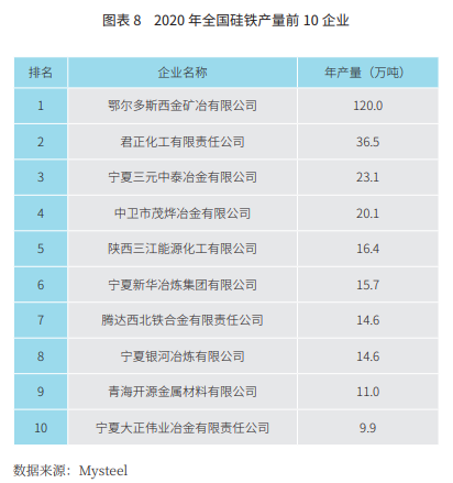 铁合金企业数量多,单个企业产能较小,产业集中度整体看较 低。但近年来随着国家能耗双控政策的推进,铁合金产业不断升级, 单体小炉型逐步淘汰,实力较弱的小企业退出市场,冶炼炉型有往大 型化方向发展,产业集中度有向龙头企业集中的趋势。根据 Mysteel 统计,2020 年全国锰硅产量前 10 企业产量为 420 万吨,占全国产 量 1020.61 万吨的 41.15%。而硅铁龙头企业依靠低廉电价的优势 不断增加市场份额,根据 Mysteel 统计,2020 年鄂尔多斯西金矿冶 产量为 120 万吨,占全国产量已超过 20%,前五大企业产量占比为 40.16%。从产业集中度的角度比较,硅铁企业产业集中度高于锰硅企 业。