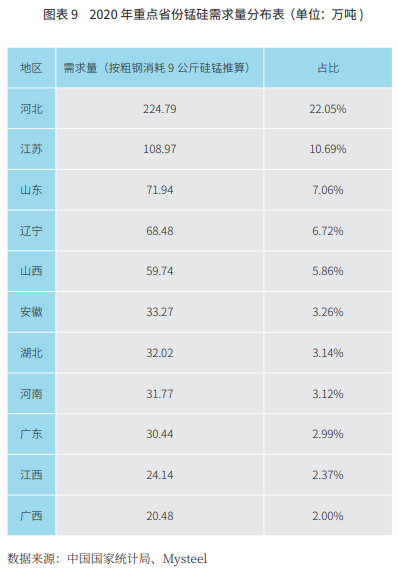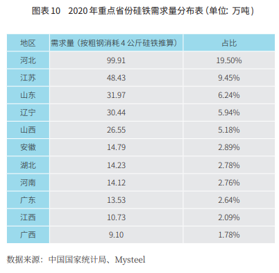 由于钢铁行业是铁合金最主要的下游行业,因此硅铁、锰硅消费 区域与我国钢铁行业产能布局相吻合,主要集中在华北和华东地区。 从 2020 年分省市粗钢产量来看,河北是我国硅铁、锰硅消费最大的省份,约占全国的四分之一,江苏也超过 10%。