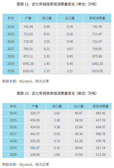 根据产量、进出口量计算的近几年硅铁、锰硅表观消费量情况见 图表 11 和图表 12。锰硅和硅铁表现消费量都经历了从高位回落并回 升的过程,主要原因在于 2014 年以前行业景气度高时铁合金产能投 放过大,但此后钢铁行业景气度整体下降后大量企业亏损停产,产量 和消费量出现较大幅度的下滑。2017 年以后,随着国家打击地条钢和 出台螺纹钢新标等政策利好的释放,锰硅和硅铁的需求均得到了明显 的提振,表观消费量大幅提高。