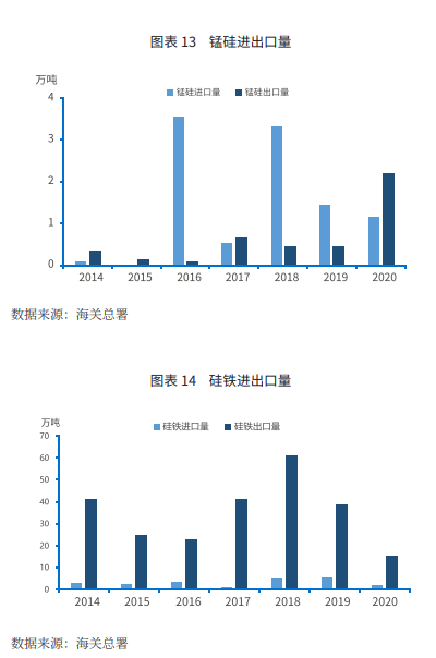 锰硅和硅铁是典型的国内市场,除了硅铁有部分出口外,其余进 出口微乎其微。出口端,锰硅和硅铁作为高污染、高耗能行业,出口 关税高达 20% 和 25%,出口难度较大,只有硅铁依靠国内低成本从 而能少量出口至美国和日韩等国家。进口端,国内产能充裕且成本较 低,因此基本不需要进口。