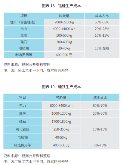 其中,锰硅和硅铁的成本构成具备一定的差异。其中锰硅最主要 的成本为锰矿成本,占比约为 50%-60%,而硅铁最主要的成本为电 力成本,占比约在 50% 左右,而原材料成本占比较小。由于电力成本 波动较小,一般情况下,锰矿价格波动较大,导致了锰硅成本波动性 远高于硅铁。