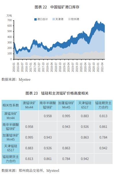 锰矿作为锰硅原料的最大成本,与锰硅价格保持着很高的相关性。 以 2017-2020 年天津港 44% 品位澳矿价格和天津 6517# 锰硅市场价 为计算基准,二者的相关性达到了 0.883。