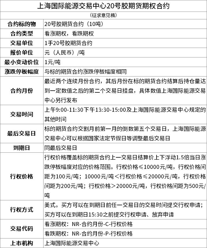 20号胶期权合约的标的物:20号胶期货合约;交易单位:1手(10吨)20号胶期货合约;报价单位:元(人民币)/吨;最小变动价位:1元/吨。