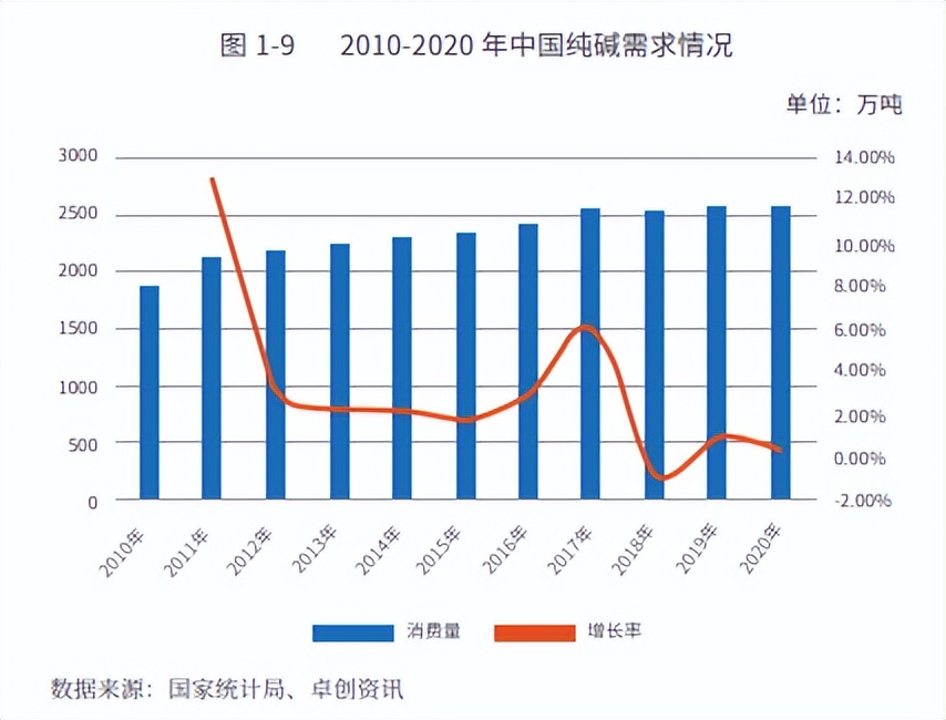 我国是世界第一大纯碱消费国。随着经济的发展,中国纯碱消 费量整体呈递增趋势,重碱需求快速增长是纯碱需求持续增长的最 主要原因。2020 年我国纯碱总需求量为 2573 万吨,较 2010 年增长 36%。其中重碱需求量 1293 万吨,较 2010 年增长 64%;轻碱需求量 为 1280 万吨,较 2010 年增长 17%,重碱需求增长对纯碱总需求增 长的贡献率达到 80% 以上。