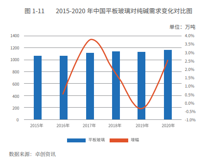 2015 年以来,平板玻璃对纯碱的年需求量始终保持在 1000 万吨 以上。近 5 年浮法玻璃产能呈小幅增长态势,2016 年受房地产市场回 暖提振,供需环境好转,行业利润上升明显,2017-2018 年浮法玻璃 产能增速保持高位。环保因素造成 2019 年沙河部分产线停产,浮法 玻璃产能增速降至低位。2016-2020 年中国光伏玻璃产能逐年增长, 2020 年光伏玻璃产能增速明显。2020 年平板玻璃行业消费重碱 1162 万吨,同比增长 2.6%。