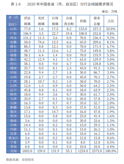 国内纯碱需求量排名前十的省(市、自治区)分别是:山东、广 东、河北、安徽、江苏、湖北、福建、浙江、四川和河南,需求合计 1747.8 万吨,占全国纯碱总需求量的 67.9%。平板玻璃行业对于地区 纯碱需求具有明显的带动作用。河北、安徽、广东、湖北和山东五省 的平板玻璃产能集中,是重碱需求量最高的地区。