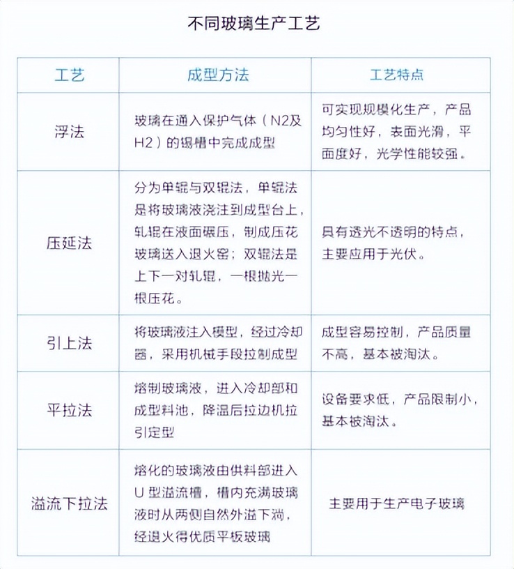 平板玻璃生产工艺主要有压延法、有槽垂直引上法、对辊法、无槽垂直引上法、平拉法和浮法玻璃等。